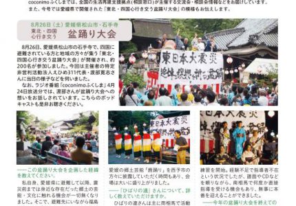 避難してきた・避難先から戻ってきた親子が集い、悩みや不安を話せる場の開催や、復興公営住宅で暮らす人と福島の人々との交流や繋がりを目的としたイベントなどを開催します。 緩やかに、しなやかに人々が繋がりあい、互いの想いや選択を...