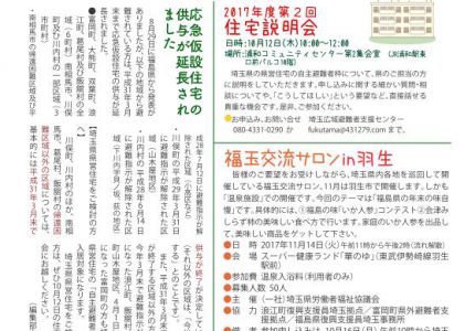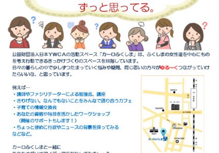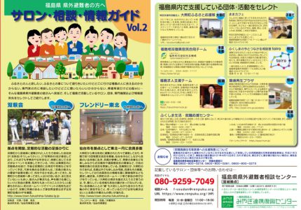 避難してきた・避難先から戻ってきた親子が集い、悩みや不安を話せる場の開催や、復興公営住宅で暮らす人と福島の人々との交流や繋がりを目的としたイベントなどを開催します。 緩やかに、しなやかに人々が繋がりあい、互いの想いや選択を、大切に認めあう場です。 子どもから若者、お年寄りまでどなたでもご利用いただけますよ! ダウンロードはこちら (PDF 1MB) 開館日時 常設ではあ...